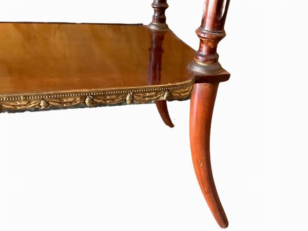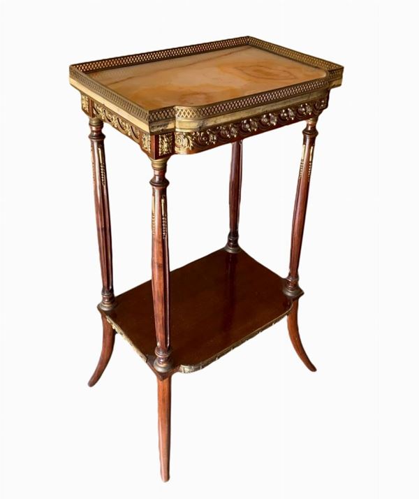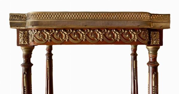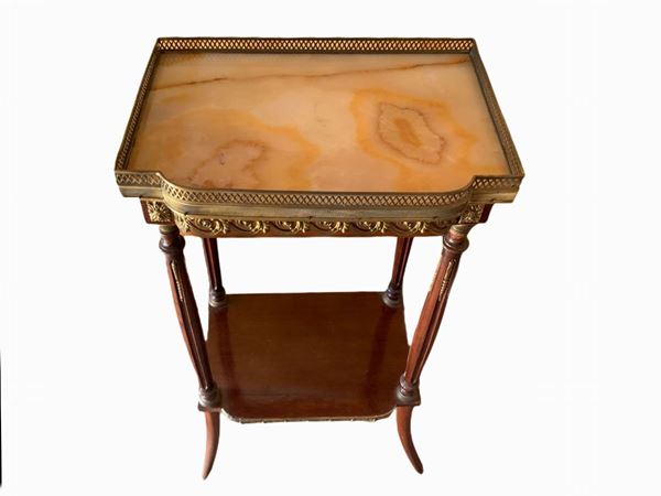 Table with wooden structure, with brass and marble on the surface., 20th century.