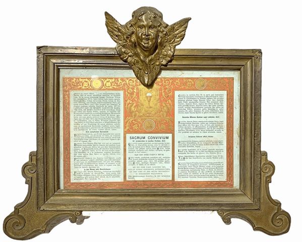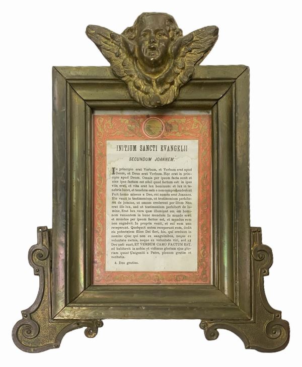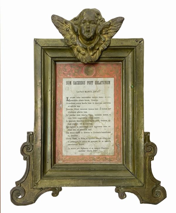 Trittych of wooden paper covered with brass with winged zephyrs at the top, 20th century