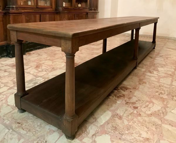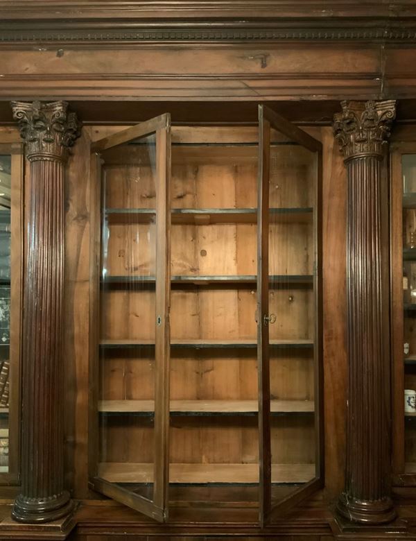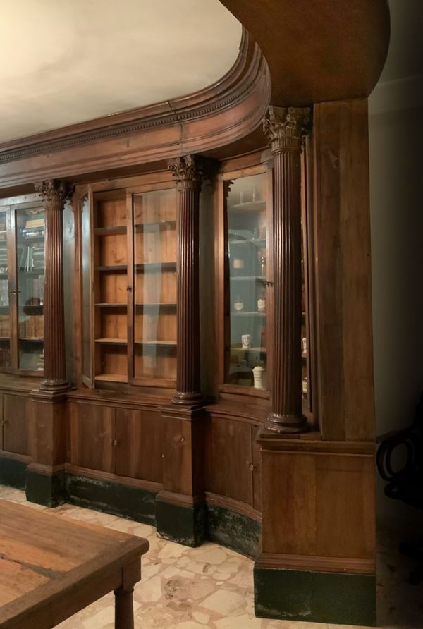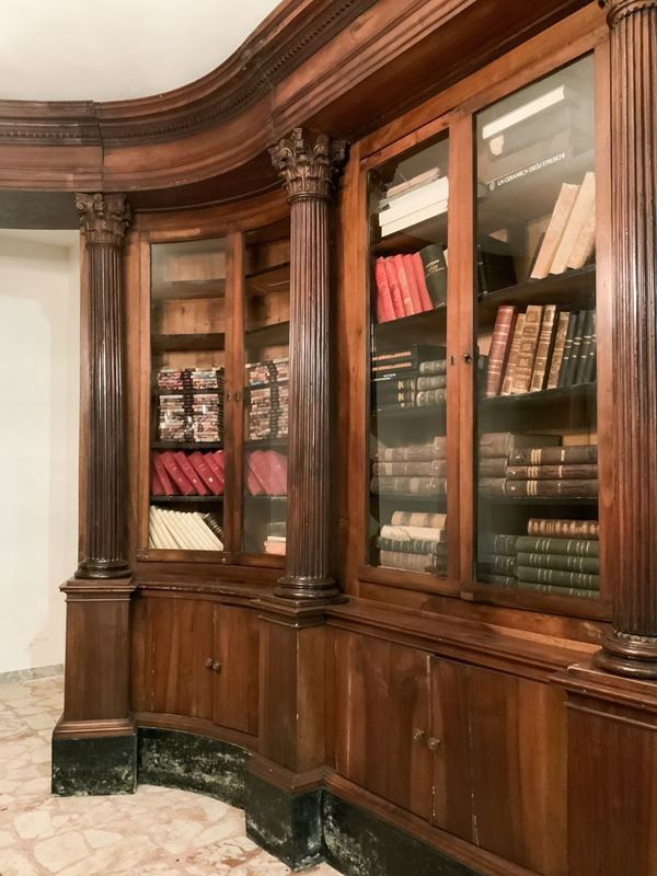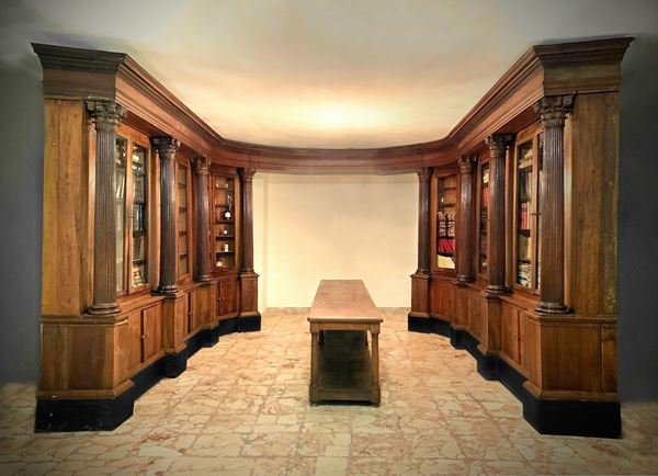 Of Calatine origins already located in a prestigious building in Caltagirone and now in a notary's office, it is a unique example of Sicilian cabinet making commissioned by a noble Sicilian family. The bookcase consists of six modules, three on each side, of which the last is curved which with an entablature at the head agrees with the opposite side, creating a semi-elliptical or horseshoe shape. Each module consists of a base H cm 90 with double door in wood surmounted by a showcase with double door H cm 175 to which an entablature with several orders of moldings, superimposed on a notched frame, acts as a hat. The overlying shape assumes a projecting aspect, typical of the 18th century, the height of the whole hat is 29 cm. Number of eight fluted Corinthian columns, four on each side H 175 cm of excellent sculptural quality, embellish the side elevations giving volume and decoration to the whole wooden composition of the bookcase. The conversation status is excellent, the piece of furniture can be disassembled into several parts and is available for transport to any destination.