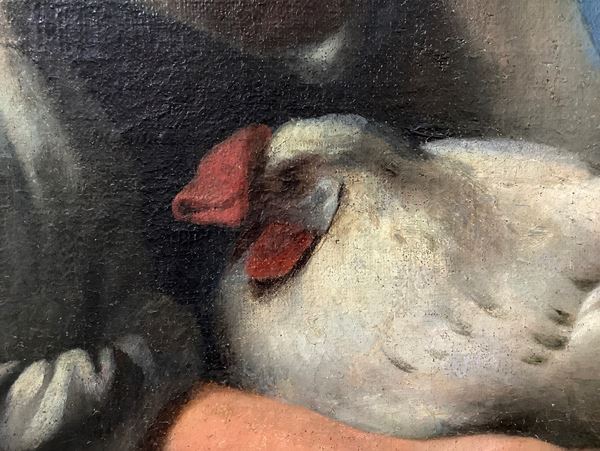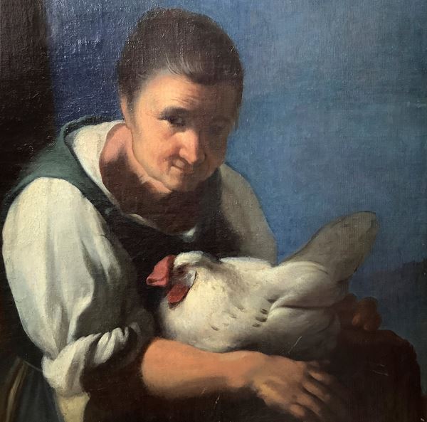 "In uno scarno e appiattito sfondo bluastro, unico riferimento a una spazialità esterna, emerge dalla penombra la figura di una anziana donna ricurva, dalla fronte solcata da rughe e dalle robuste braccia – provate dal duro lavoro nella terra - che ne delineano il ruolo di campagnola. Con una sobria composizione di stampo naturalistico, la donna può considerarsi vera protagonista del dipinto anche se, nel leggere il suo lasso sguardo - provato dalla stanchezza e dall’età – l’osservatore viene invitato a concentrarsi sul candido volatile, delicatamente appollaiato su un posatoio riempito di fieno.