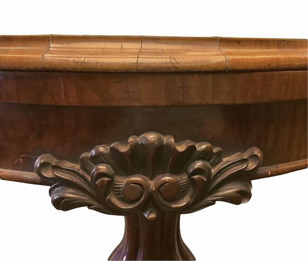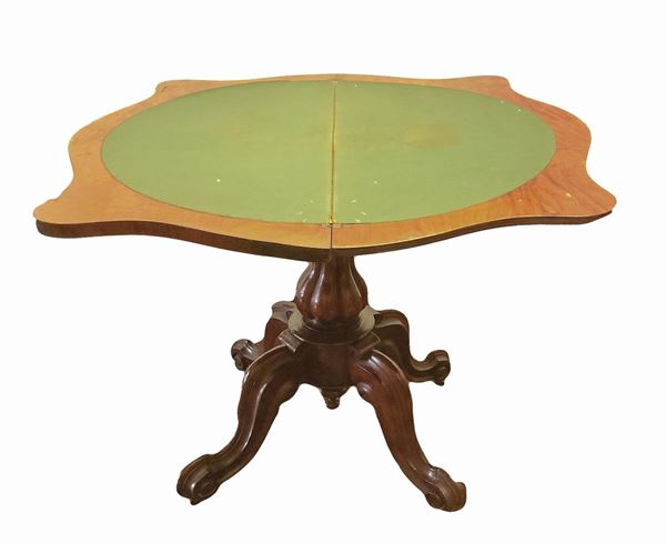 Tavolo da gioco con piano in radica, piedi a quattro razze con sostegno baccellato, XIX secolo