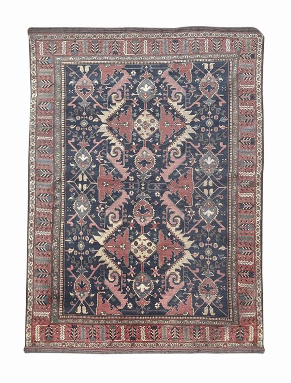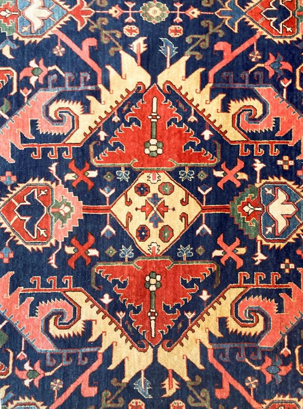 In shades of red and blue with phytomorphic elements and ethnic motifs.