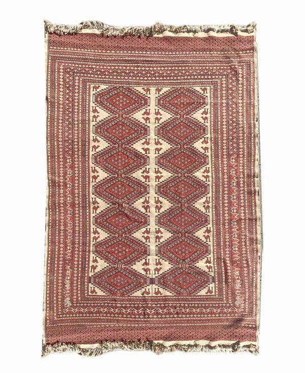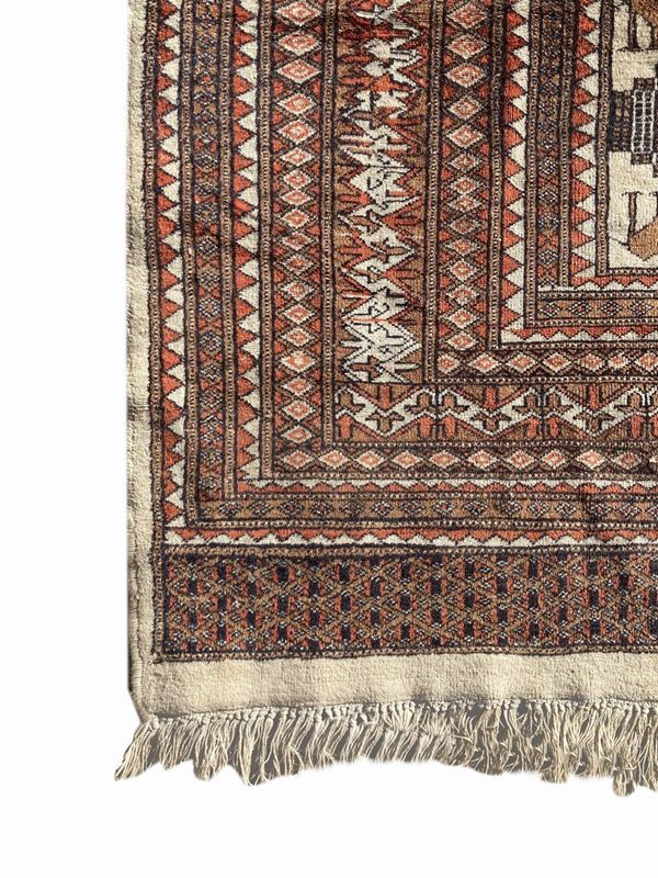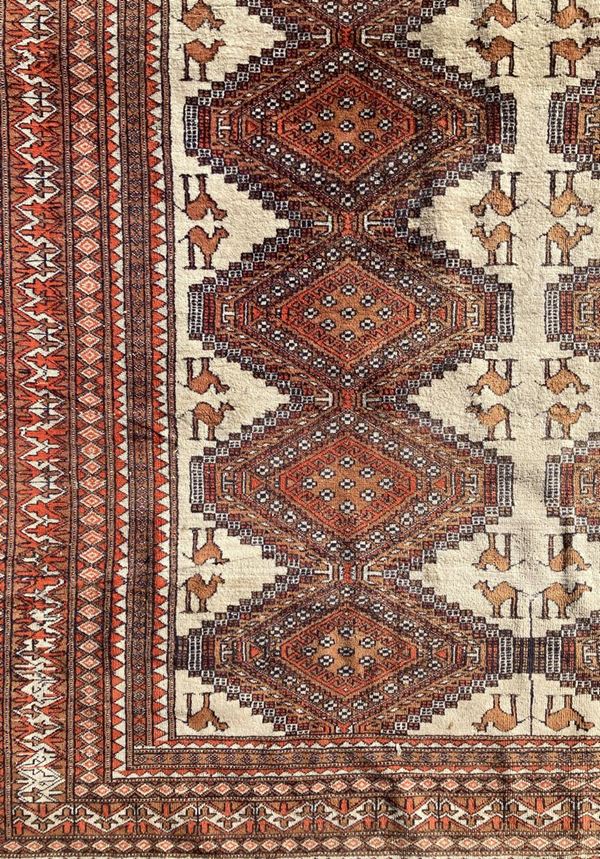 In shades of rust and beige, with geometric motifs and small dromedaries