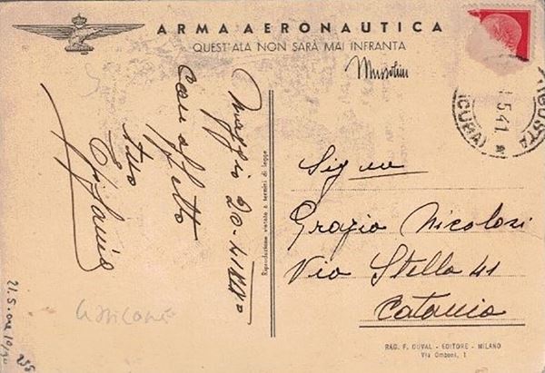 "This wing will never be broken" Mussolini. Traveled, ruined postage stamp. Edit. Ras. Duual - Milan.