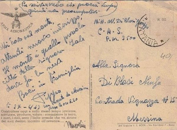 Propaganda: fight today. Mussolini. Traveled in 1943 with the postage stamp removed. Ediz. D'Arte V. E. Boeri Rome