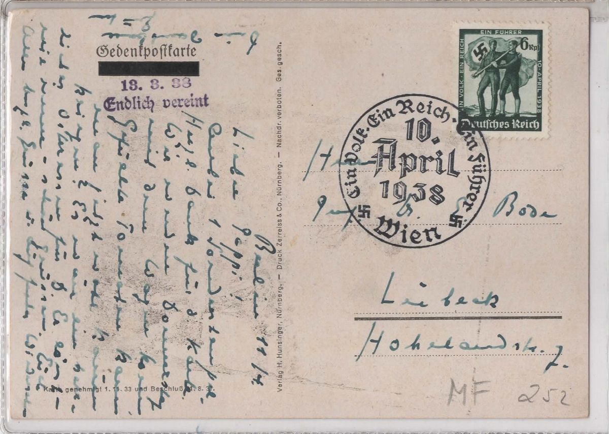 Traveled 10.04.1938 - Vienna. Illustrator Gustave Goetschel. Commemorate the cadui with the inscription "however you won". H. Hunsinger Edition - Nurnberg. Excellent condition.