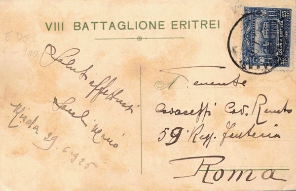 Traveled from Eritrea 29/06/1925. Illustrator Leonida Emel 1864- 1940. Lithography Doyen Turin. Excellent condition.