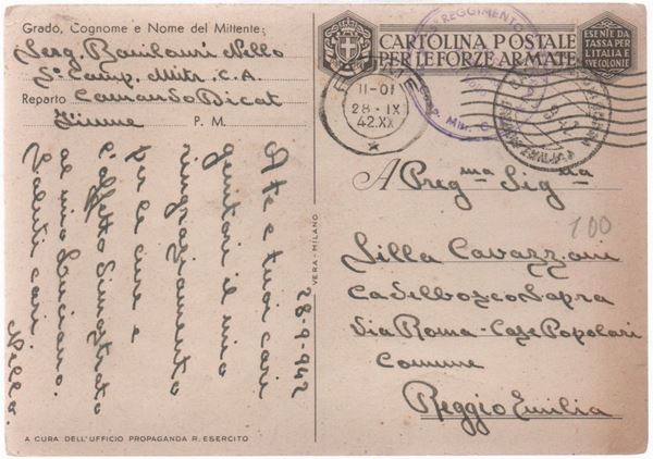 The Auction House Art La Rosa offers for sale postcards of the dictatorships of World War II only for the purposes of civic education and defense against unconstitutional or anti-constitutional acts, for historical and scientific research and military historian. The bidder undertakes to purchase these works for historical and scientific reasons and for those mentioned above and not for propaganda purposes.
