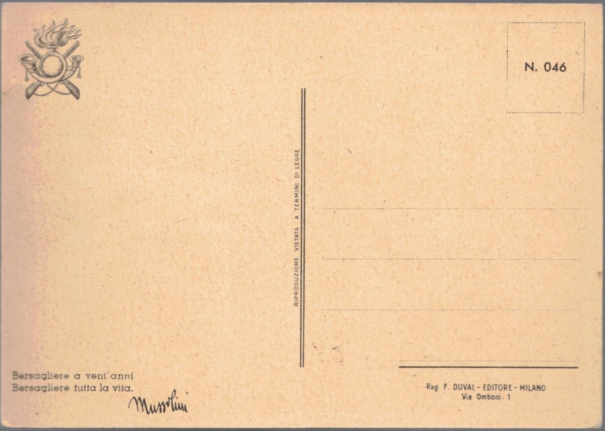 Illustrator Giuseppe Bartoli 1911- 1980. On the back, words Bersagliere at twenty, Bersagliere for life. Edition F. Duval Milan. Good condition.