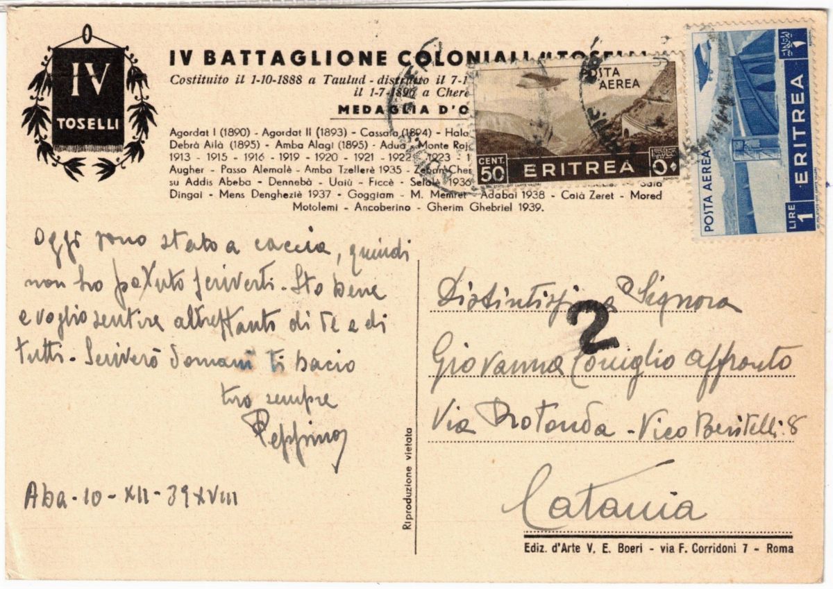 Traveled to Eritrea 10/12/1939. Art Edition & nbsp; V.E. Boeri Rome. Good condition.