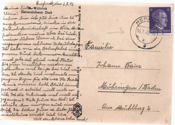 On the front portrait drawn by Wulfang Willrich, war painter 1887 - 1948 with autograph at the top. Traveled 3- 7- 1943. Good condition. & Nbsp;