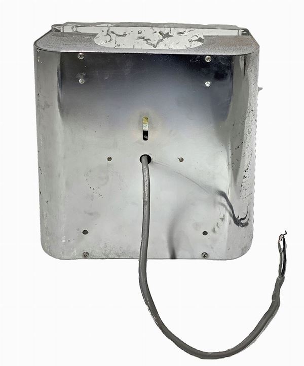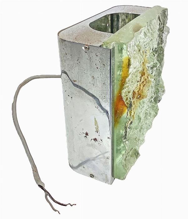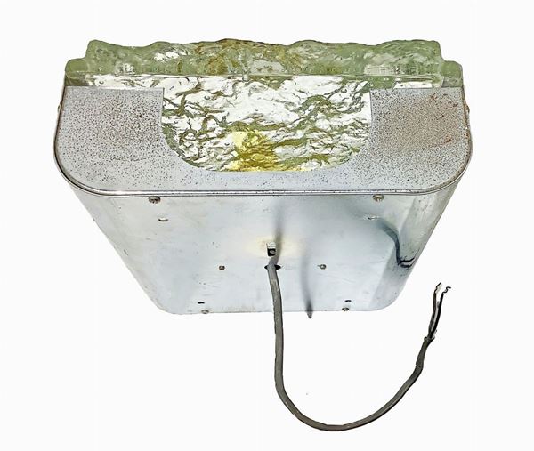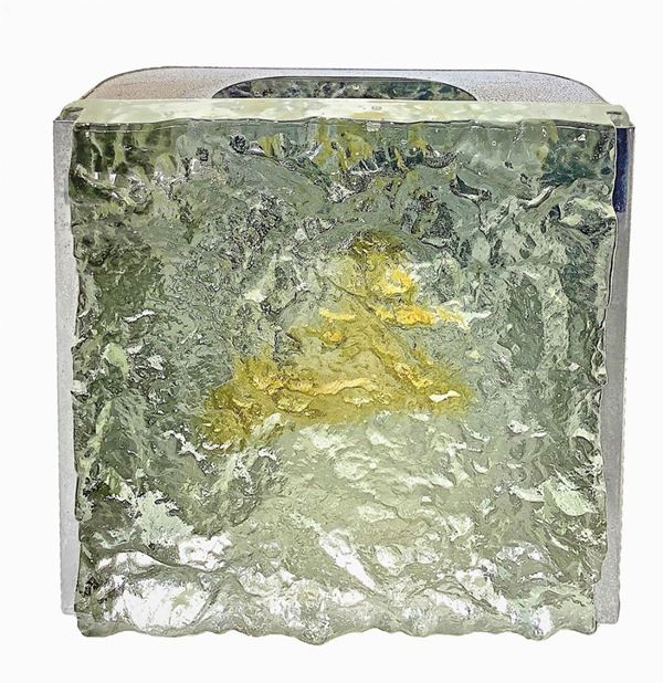 Made in Murano in the Mazzega style. Square shape with chromed metal structure, thick glass diffuser with inclusions of glass paste in shades of amber. Surface with iced finish. Signs of use and traces of oxide.