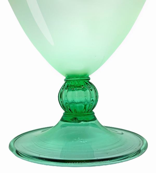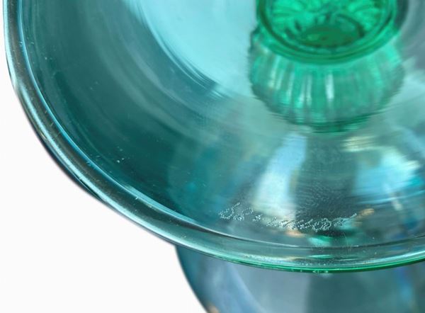 Veronese model in shades of aqua green, circular foot, glass paste junction, globular body in blown glass, small everted neck. Edge of the base-body made of glass paste. Signature of the diamond point manufacture.