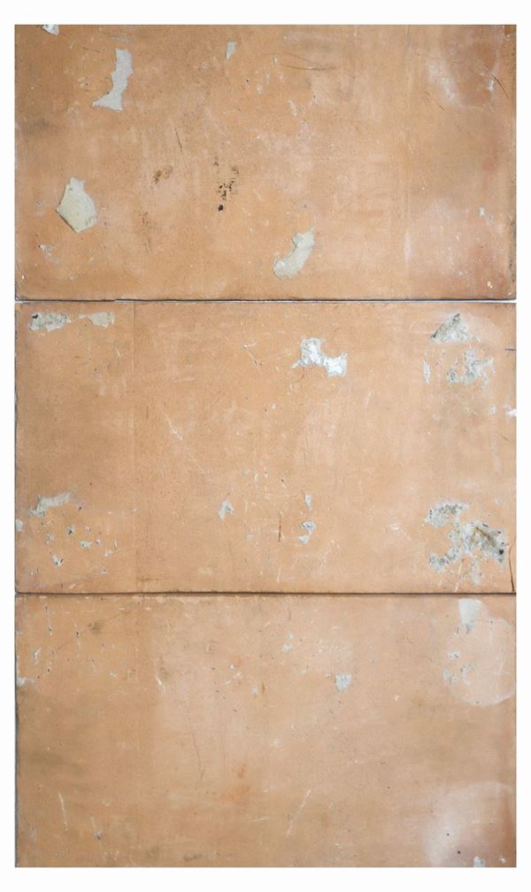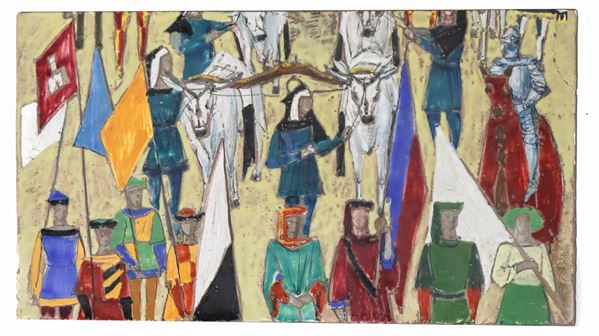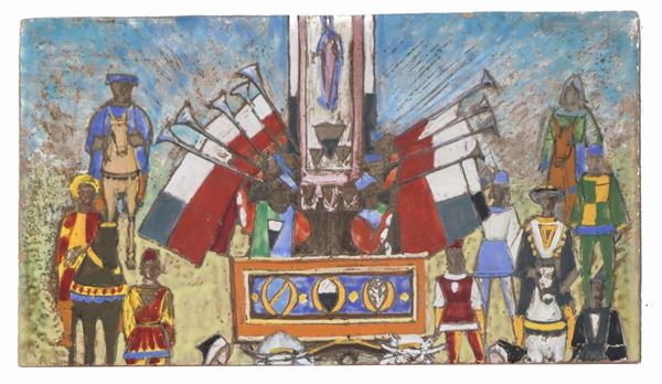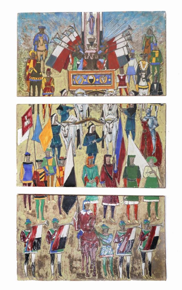 Depicting Palio di Siena and procession in historical costumes, cart with portrait of the Madonna pulled by oxen in the Piazza del Campo. Composed of three pieces