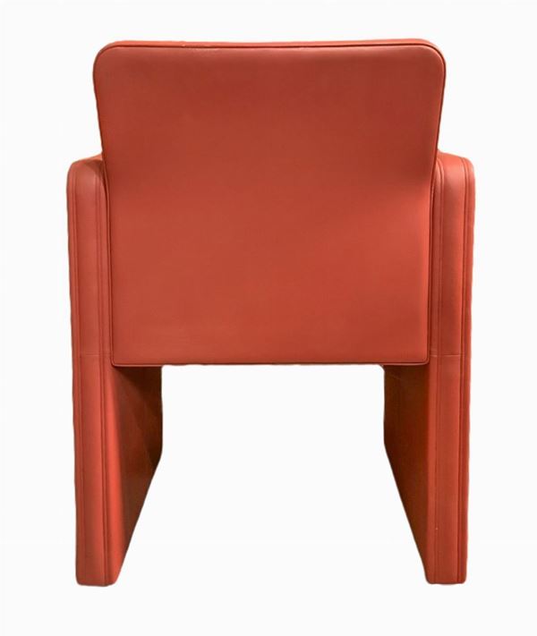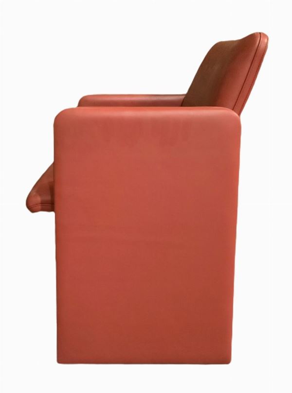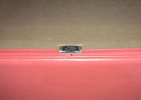 Metal structure covered in salmon-colored leather, with wheels. Brand of the manufacture imprinted