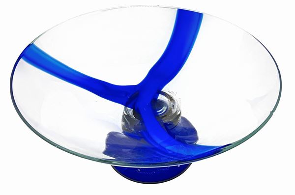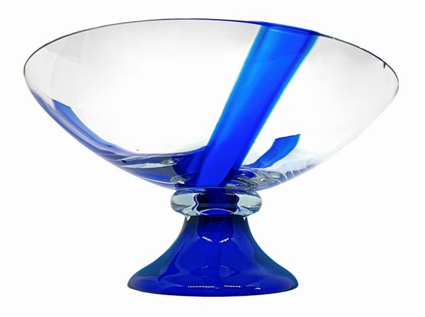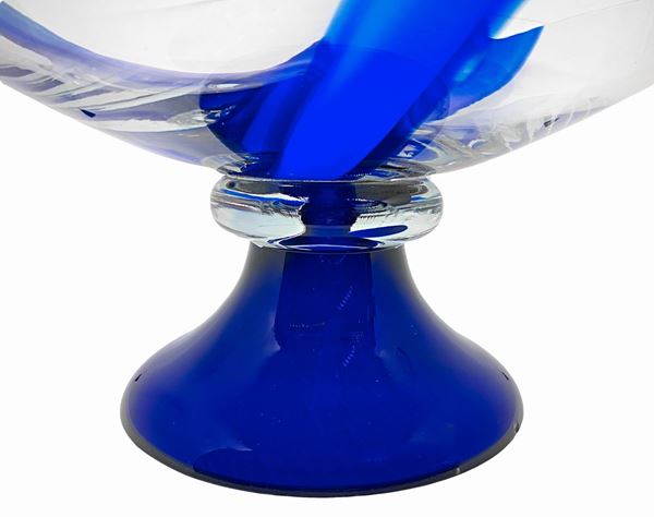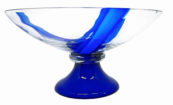 Large glass stand with blue base and transparent cup with inclusion of blue bands.