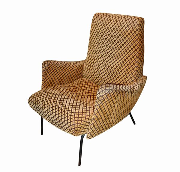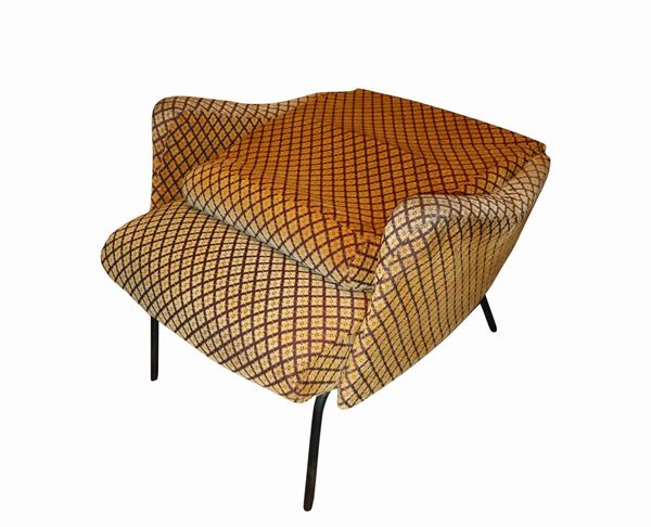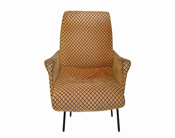 Pair of armchairs with structure in wood and black lacquered metal, 1950s
