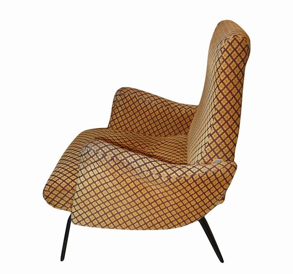 Reclining backrest and retractable feet. Original period fabric in mustard tones with a diamond pattern. Signs of use. & Nbsp;