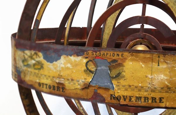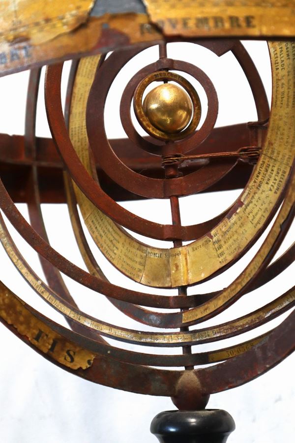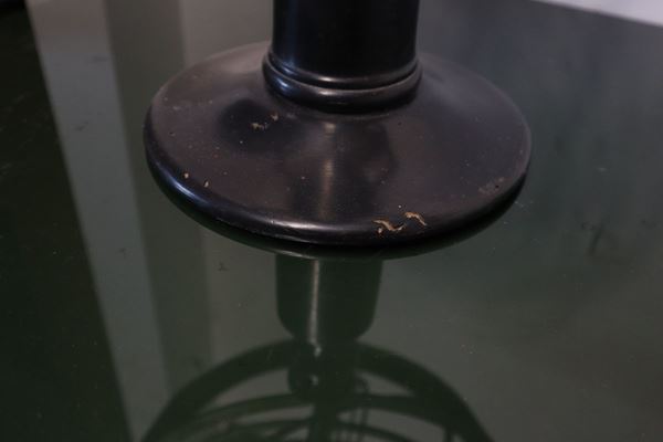 Base in black ebonized wood. Metal rings covered in printed paper, missing on the paper