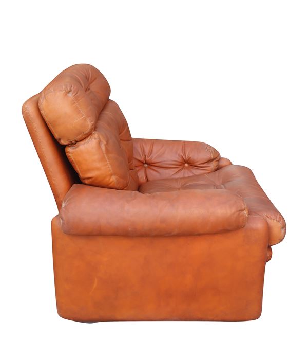 With wooden structure, leather upholstery in shades of brown. Signs of use