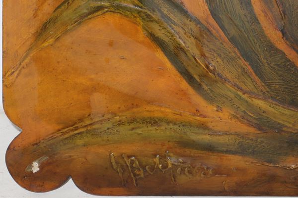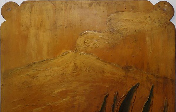 Decorative panel depicting succulent plant and Etna in shades of ocher