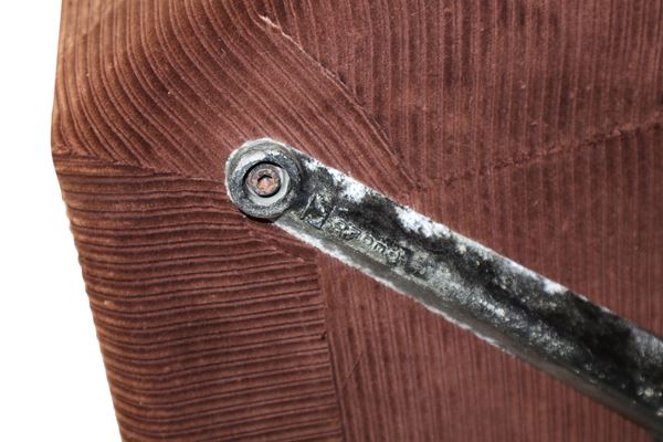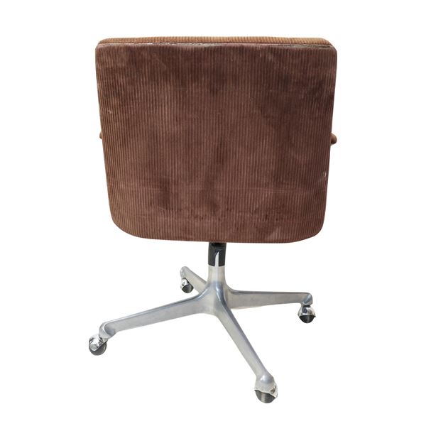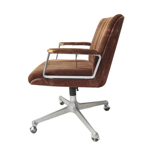 Prod. Techno Dis. O. Borsani. Structure in die-cast satin aluminum. Upholstery in fabric in shades of brown. Signs of use, to be reconditioned