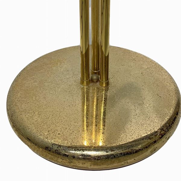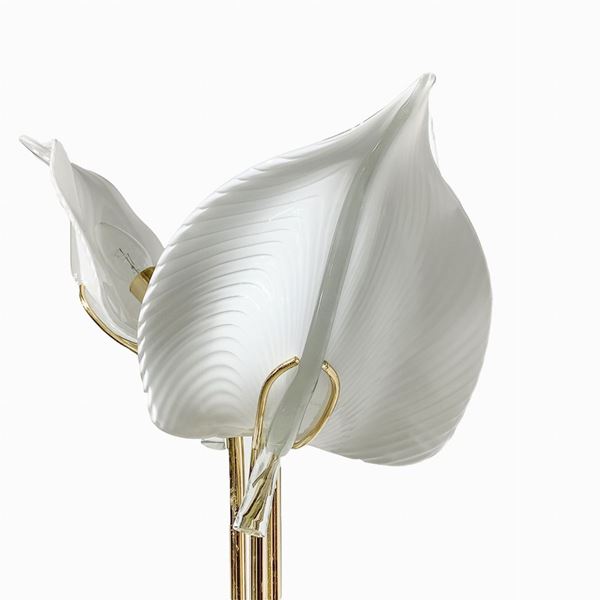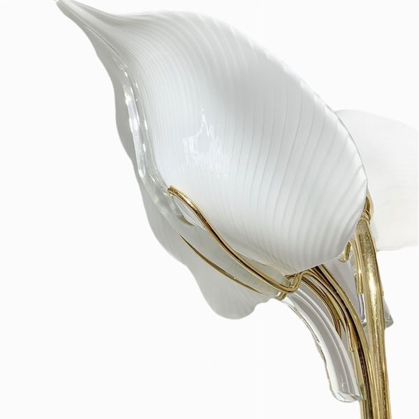 Floor lamp in golden metal with three lights with glass in the shape of calla lilies