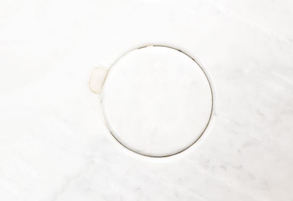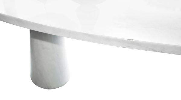 Elliptical-shaped top supported by two truncated cone-shaped feet by dry jointing, there is a small gluing and small faults on the edge of the top, marks along the top.