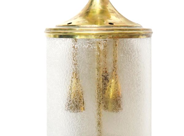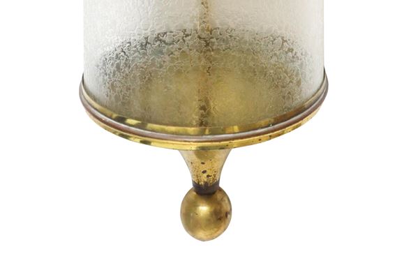 Golden brass structure, acid-finished glass diffuser. Signs of oxidation