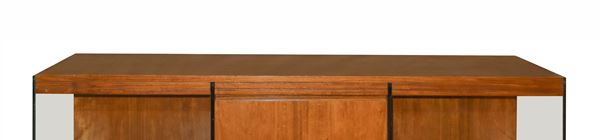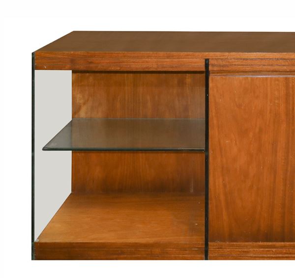 Prod. Attrib. At Tecno Varedo. With oak veneered plywood structure, glass sides and shelves with rounded corners, marked Securit Saint Gobain. Signs of use