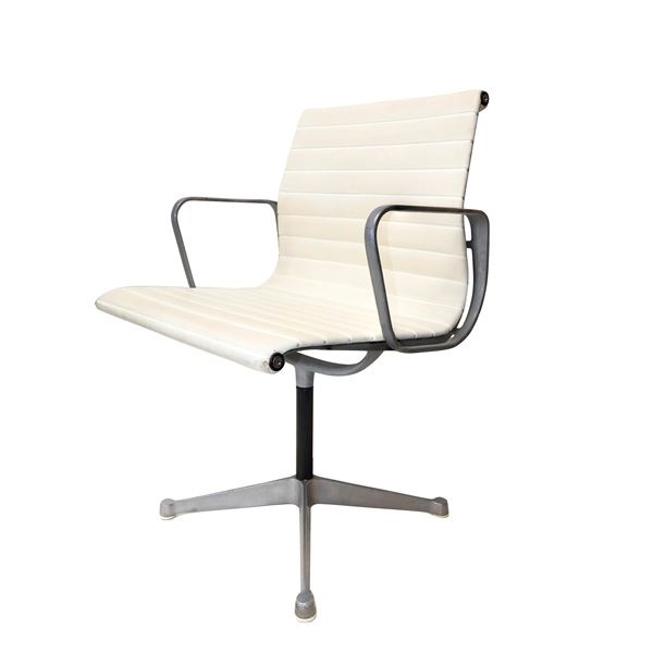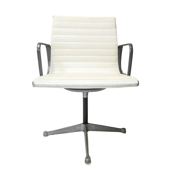 Prod. Herman Mille, DIS. C&R Eames. Pair of chairs with die-cast aluminum structure, ribbed leather upholstery in white tones, signs of use