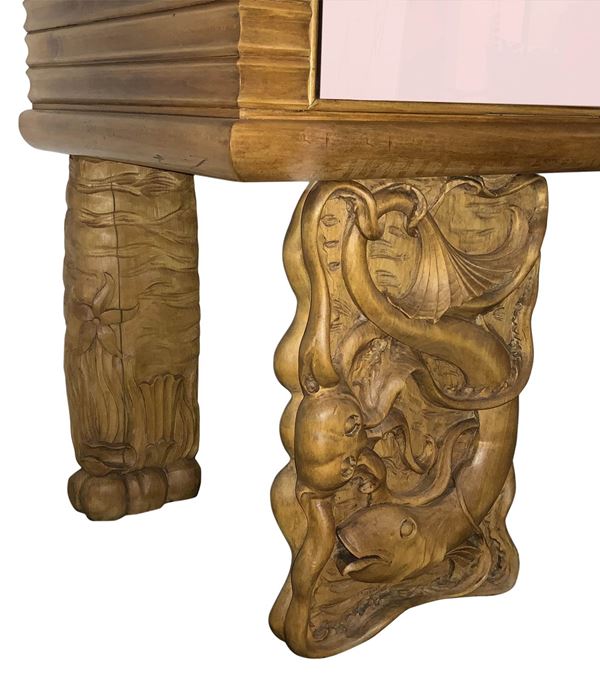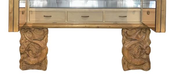 Structure in light wood, sculptural feet depicting an aquarium, application of mirrors in shades of bronze, handles and details in cast brass. Previous restorations, one lock not working.