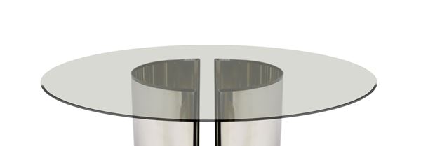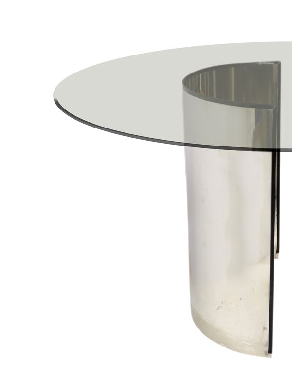 Dining table composed of two sheets of curved steel that can be freely placed, glossy finish, circular top in thick transparent glass. Signs of use.