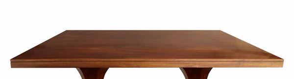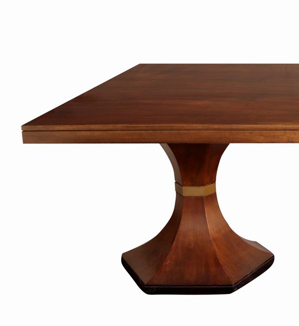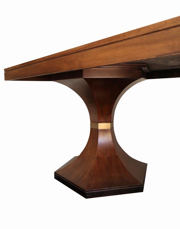 Italian production. Table with rectangular top in walnut, double foot in mahogany with hexagonal base and detail in brass. Traces of oxide and signs of use