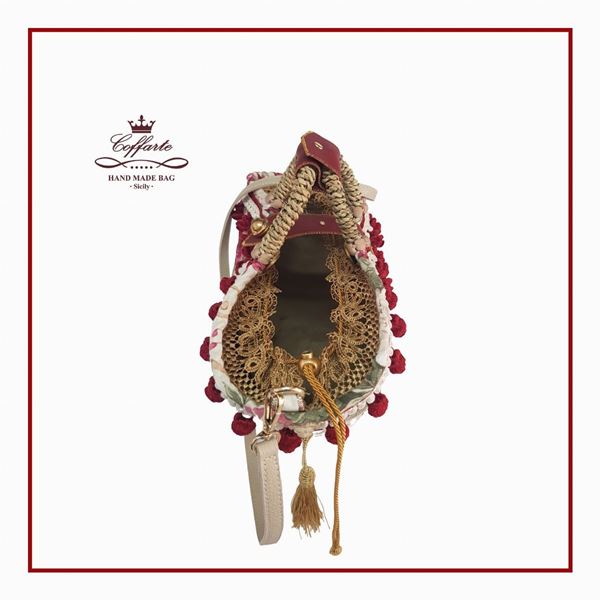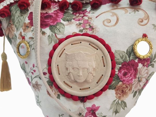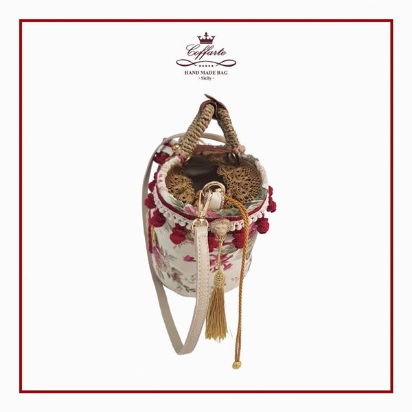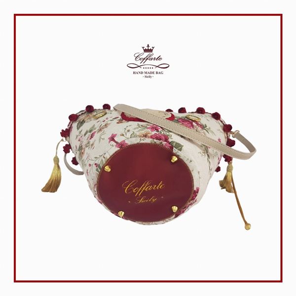 Cover in printed cotton with rose pattern, fashion and trendy with central insert in engraved stone, stone mirrors and typical Sicilian trimmings sewn entirely by hand, coffarte logo on the back and side lions' heads with tassels. < span style="background-color: hsl(var(--bs-white)); color: hsl(var(--bs-gray)); font-size: var(--bs-body-font-size) ; text-align: var(--bs-body-text-align);">Multipurpose use, with handle and adjustable and removable shoulder strap. Cbell and bag closure lace inserts.