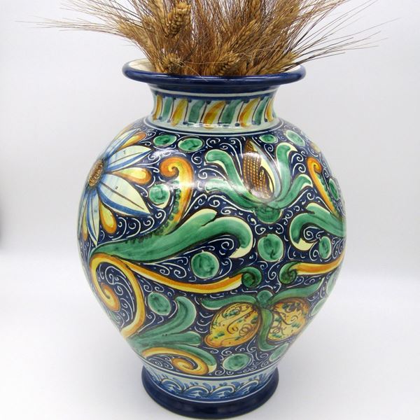 Oval-shaped vase, margheritone decoration with cobalt blue background with graffiti (typical decoration of the 19th century in Caltagirone, also present in the Caltagirone Ceramics museum). Traditional enamel, but iridescent gold and antiqued effect.