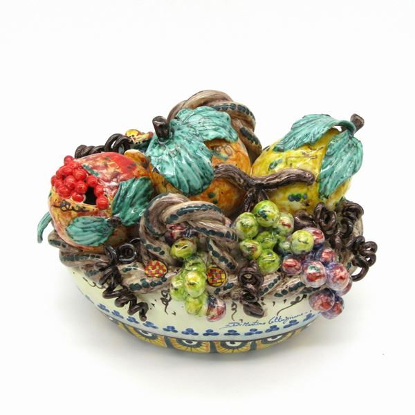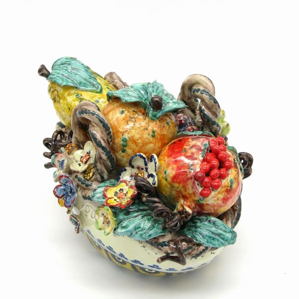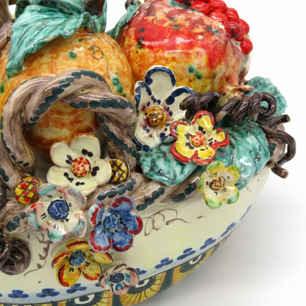 Centerpiece basket in the shape of a Sicilian coffa, with fruit inside. Entirely shaped and modeled by hand, from the basket to the flowers, with attention to the smallest details, realistic fruit. Intense and lively colors, iridescent gold-effect enamel, brilliant in the light. Basket decorated with peacock tail and emerald profiles.