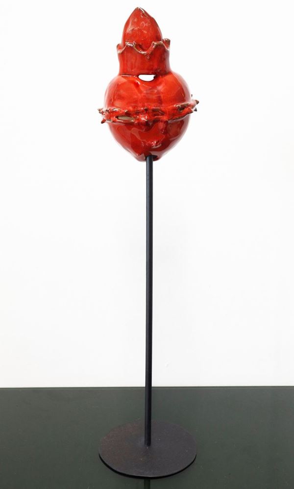 Heart in glazed ceramic on an iron base. Reworking and reinterpretation of the typical ceramic manufacturing. It was born from the need to give shape to something which, in the collective imagination, was linked to the popular tradition of the land of origin of the creators, Sicily, and which had a strong symbolic meaning. The solemnity of the Sacred Heart is highlighted but at the same time toned down by the use of colour.