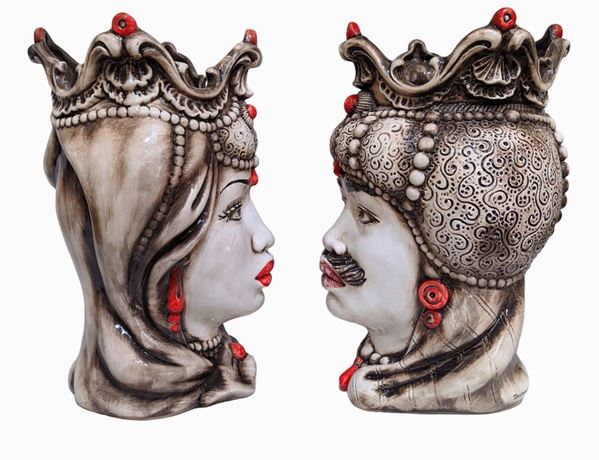 Couple vases with dark brown heads in hand-painted Sicilian ceramic.