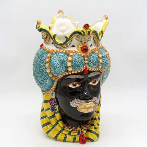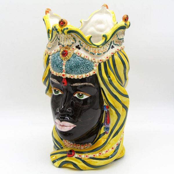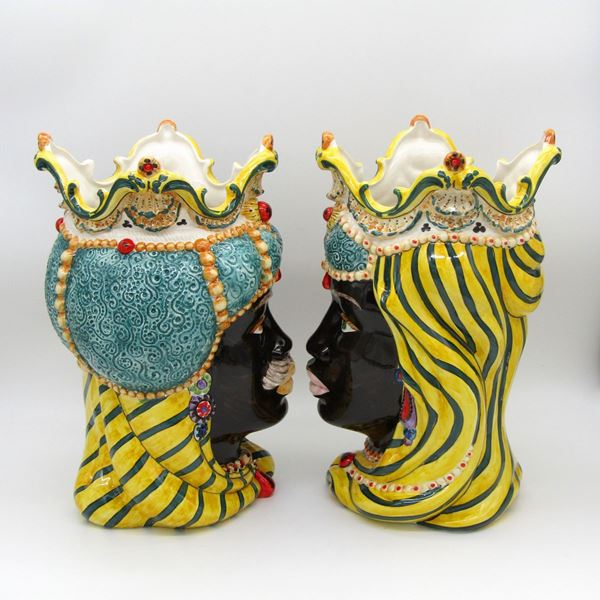 Gorgeous pair of modern heads, bright and vivid colors. Glass effect enamel. With attention to every minimum detail, both black, and with the typical colors of Sicilian playing cards: ocher yellow, red, emerald green and manganese. They look great in both classic and modern environments. Limited edition.