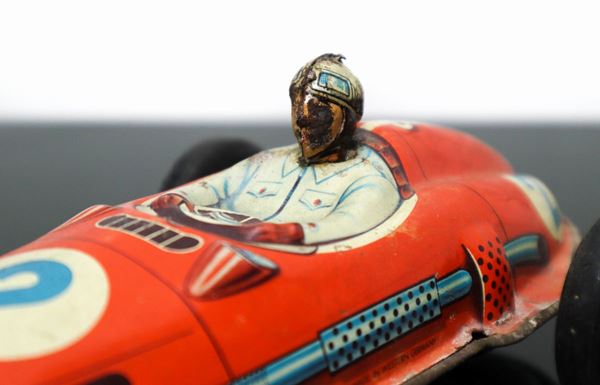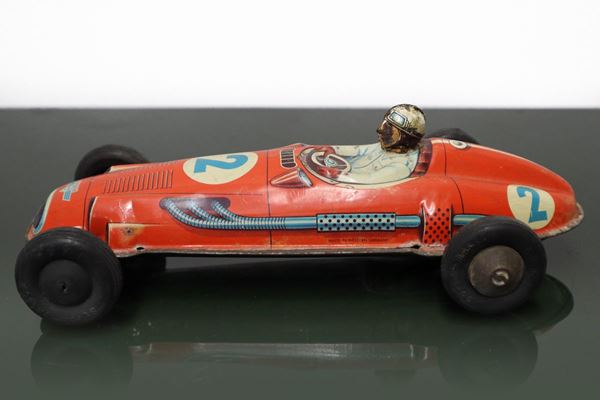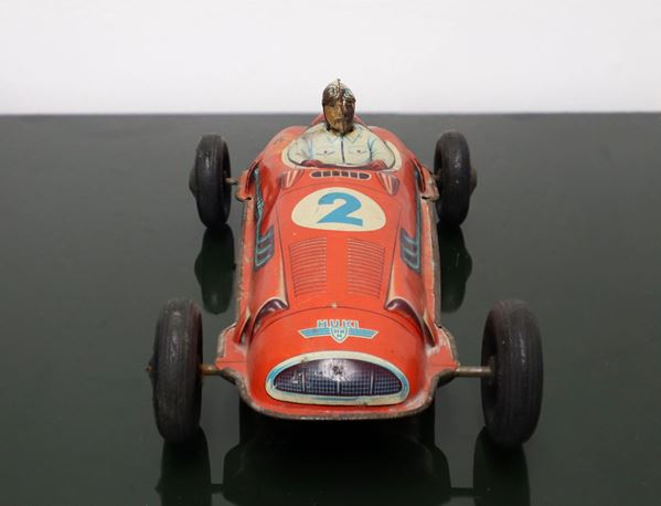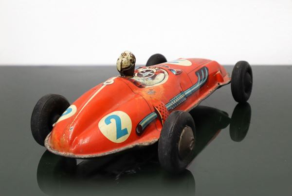 Tin car, numbered 2, Made in Germany, has signs of rust