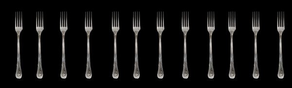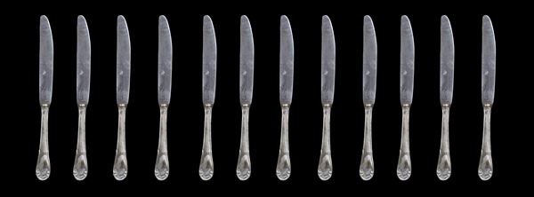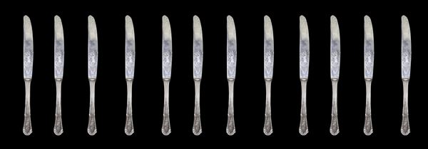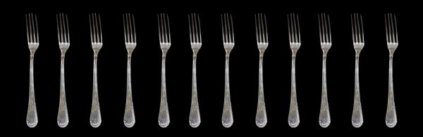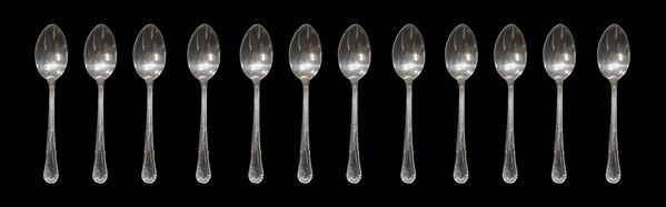Composed of: 12 forks, 12 spoons, 12 knives, 12 fruit forks, 12 fruit knives, 12 dessert spoons, 12 coffee spoons, 3 serving cutlery.