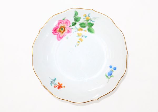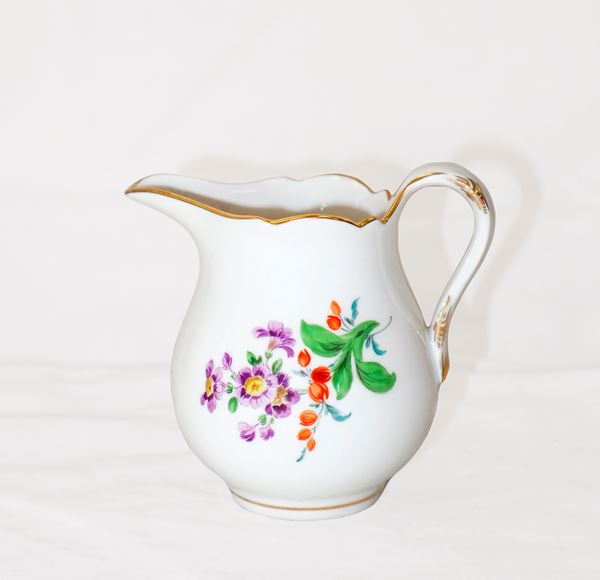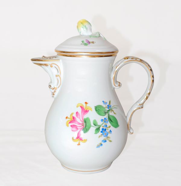 Composed of 8 cups with saucer, coffee pot and milk jug. Individual motif on each piece. Manufacturer's mark on the base.