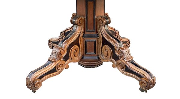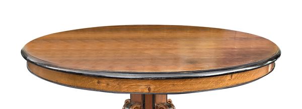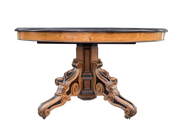 Extendable dining table in oak wood, four-spoke foot, with ebonized edges. Complete with extensions n. 2 of 25 cm and n. 1 of 50cm.