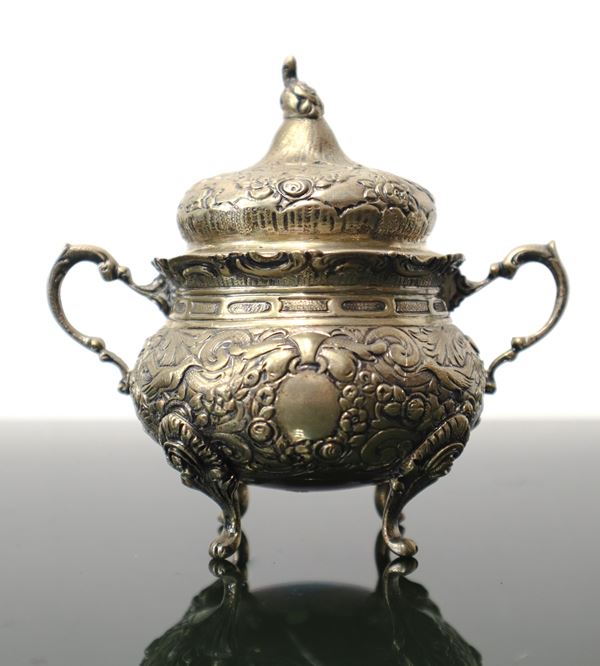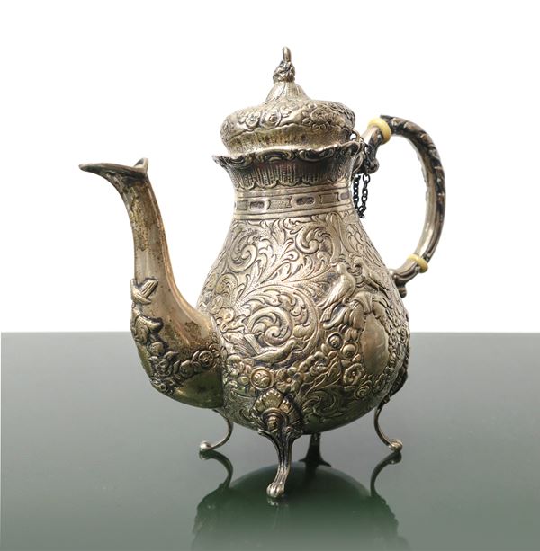 With depiction of garlands with large leaves, flowers and birds. National crescent mark and korans. Unified German hallmark in 1888. Service composed of: tray, coffee pot, sugar bowl and milk jug. Coffee pot handles with bone inserts.