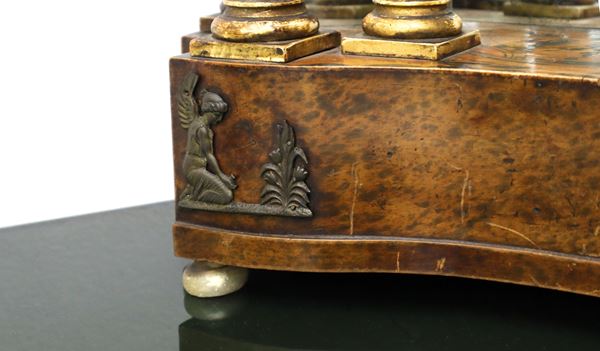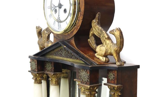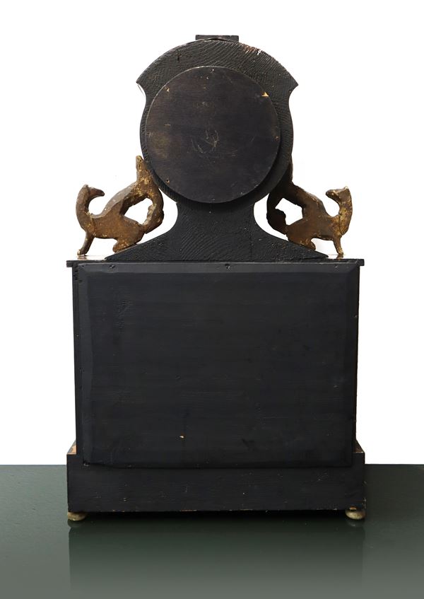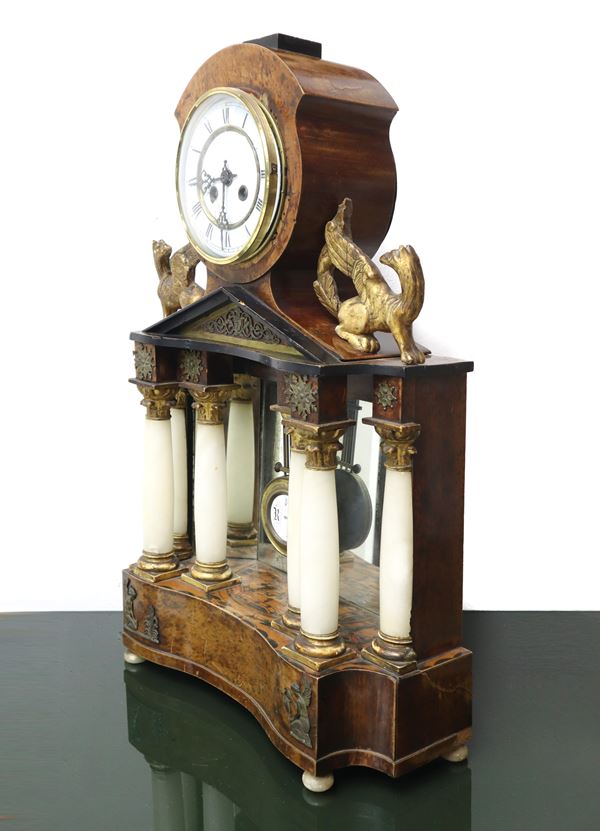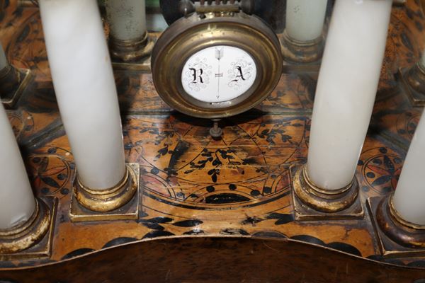 19th century, Napoleon III. Lacquered and painted wooden base with a six-column portico ina white alabaster with gilded capitals surmounted by a tympanum. White porcelain dial and Roman numerals. To be reviewed