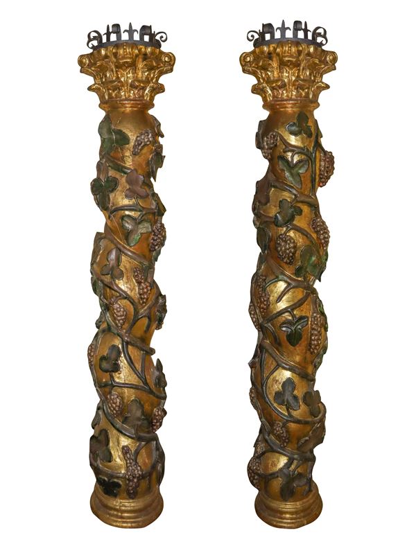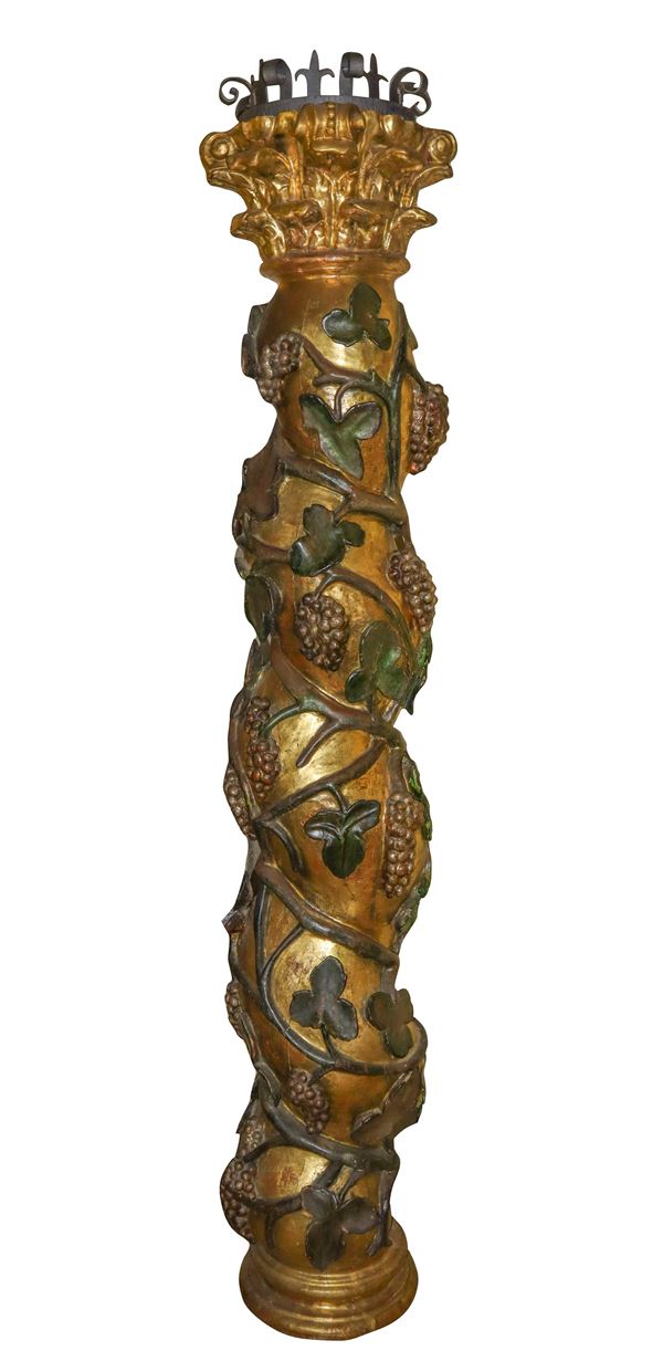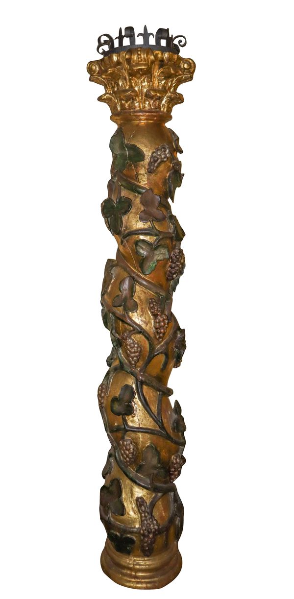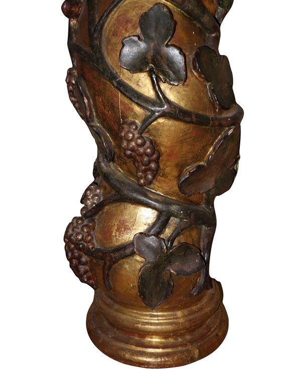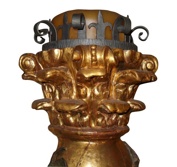 In twisted wood finely carved with vine shoots and gilded. Corinthian style capital. Origin Family Paternò Castello di Biscari.
