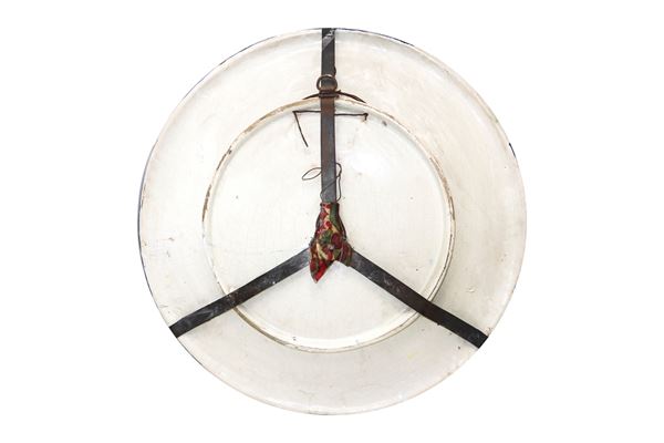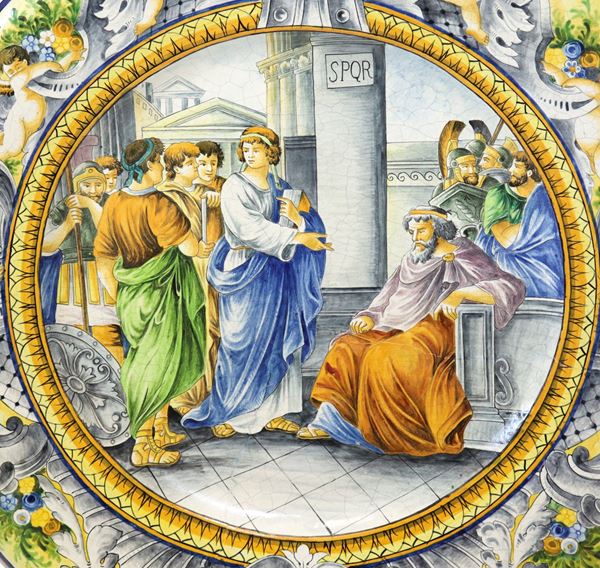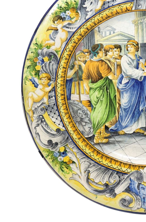 On the edges, neo-Renaissance style decorations with grotesques and winged dragons. Present restoration. Ancient Neapolitan manufacture Giovanni Mollica, former ceramist at the Real Fabbrica Ferdinandea, founded by Mollicas in 1842, becoming one of the most important majolica manufactures at the end of the 19th century, in the first half of the 1920s the young Giuseppe Macedonio collaborated and in 1927 the factory buys some molds from Guido Cacciapuoti and puts them into production. In 1930 Carlo Mollica modernized the production creating interesting works whose brand used is a crowned M, instead of the crowned N of Capodimonte.