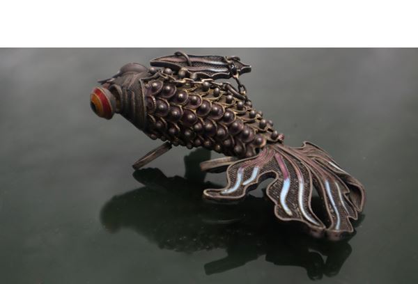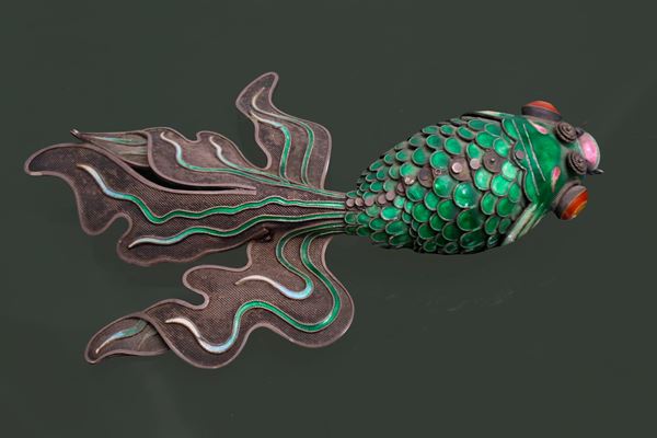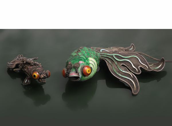 Tropical fish in cloisonné enamels and tropical fish in metal with articulated bodies, China, 20th century