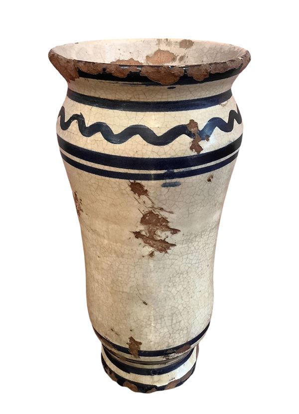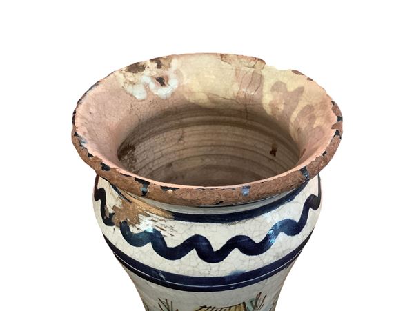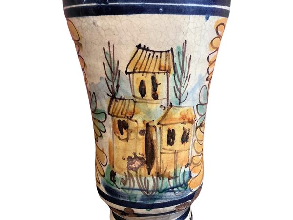 Vase on a white background with blue motifs, flowers and houses, nineteenth century